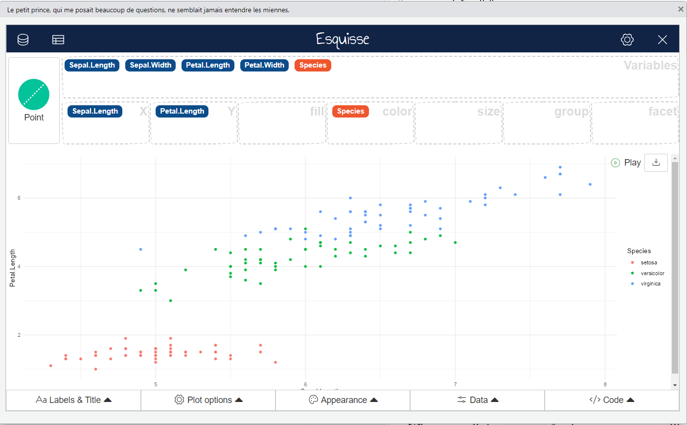 One major benefit of ggplot2 being the default visualization package in R is that it has been building blocks of choice for so many R programmers create new visualization capabilities in R and ggplot2. There are hundreds of extension packages for ggplot2 that add onto its functionality in incredible ways. For instance, gganimate creates the ability for you to have animated graphics in R! And the best part is that these extensions are usually very easy to learn because they all use the same ggplot2 mechanics as I was saying earlier. A full list of registered extensions can be found here. One really exquisite ggplot extension I would like to highlight is esquisse. This package creates a tableau-like interface inside of Rstudio, so that we can interactively plot our data! It has been a game changer for me when doing EDA.