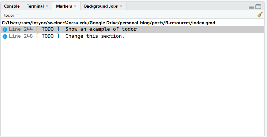 # TODO Show an example of todor<!-- TODO Change this section. -->When we call the todor() function, we get output like this. As you might have noticed, todor can detect HTML comments as well!